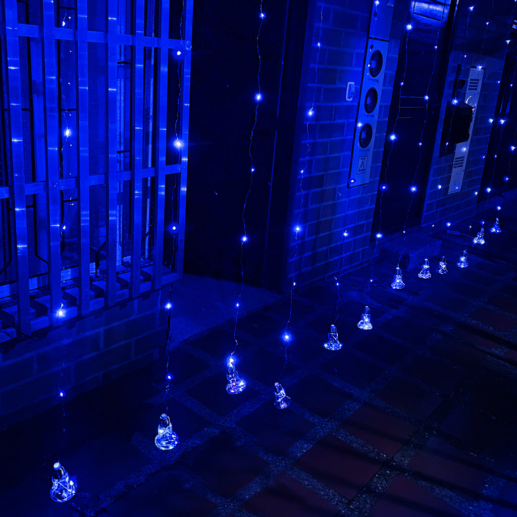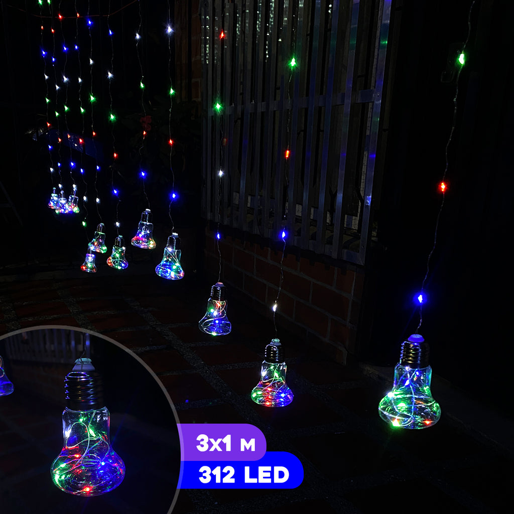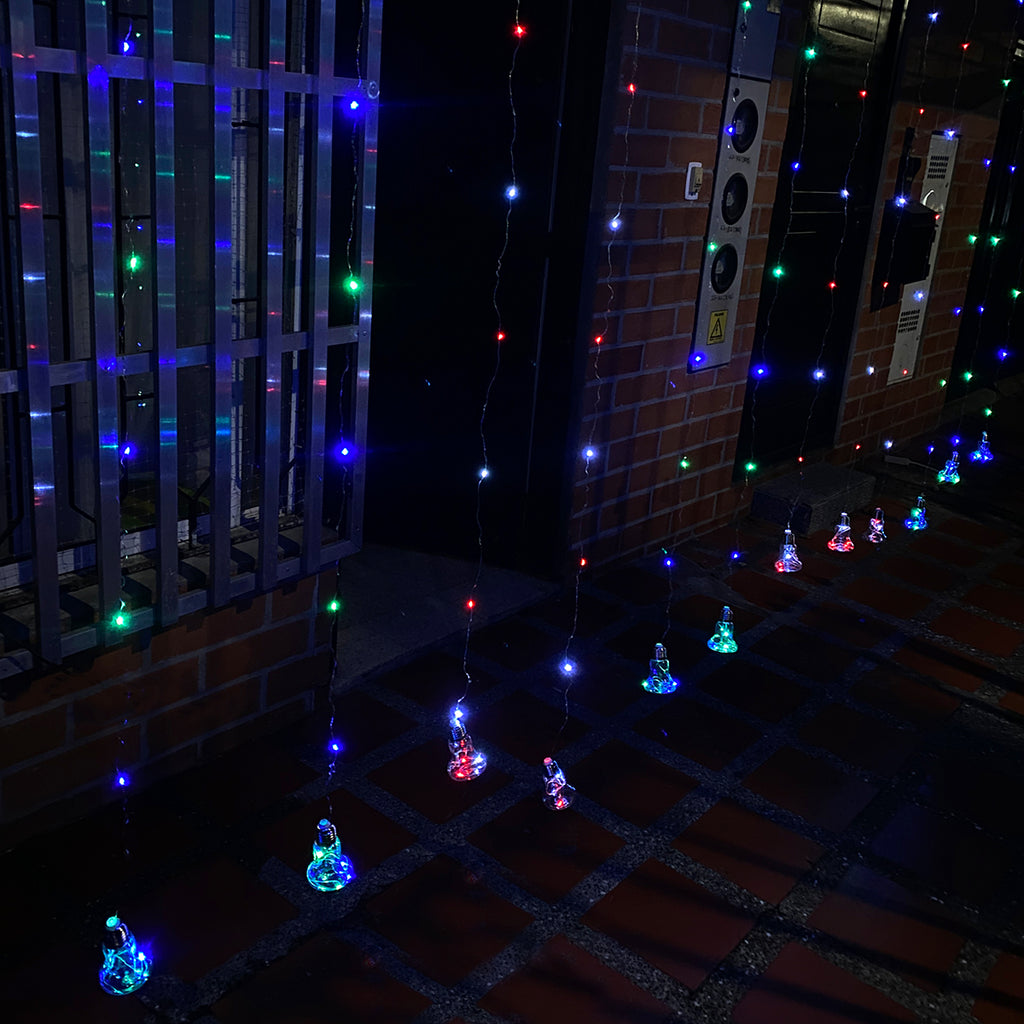 Tamaño Aprox. Producto:Largo extensión: 3 m / Caída de las tiras: 2 m / Cantidad de campanas decorativas: 12 / Espacio entre campanas: 27 cm / Luces: 312 LED.